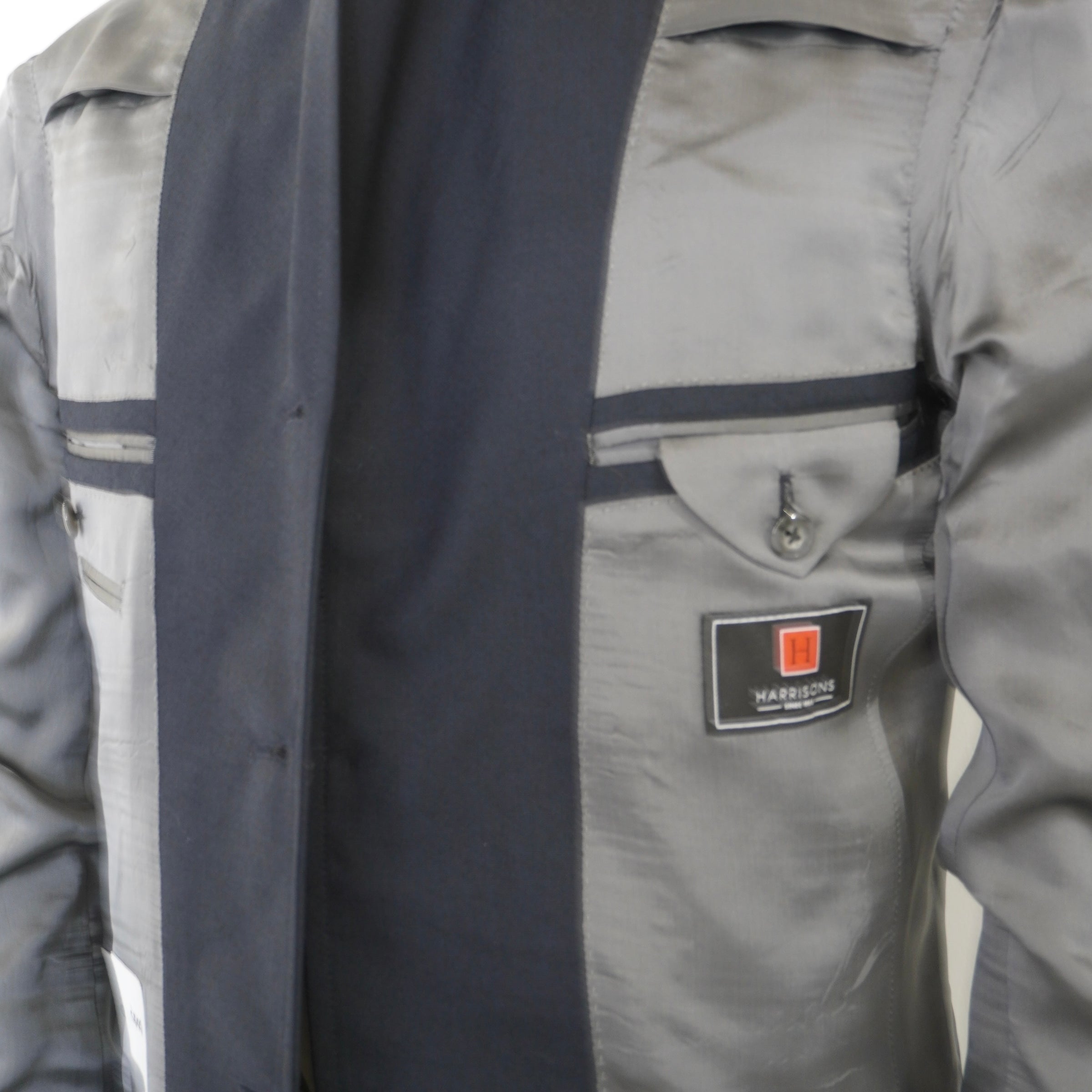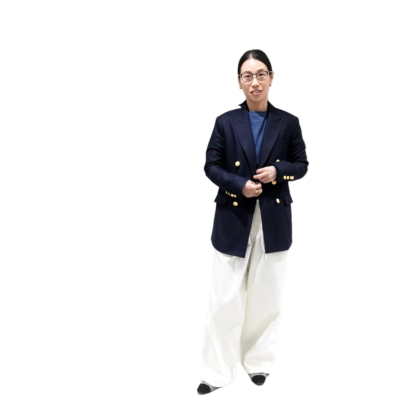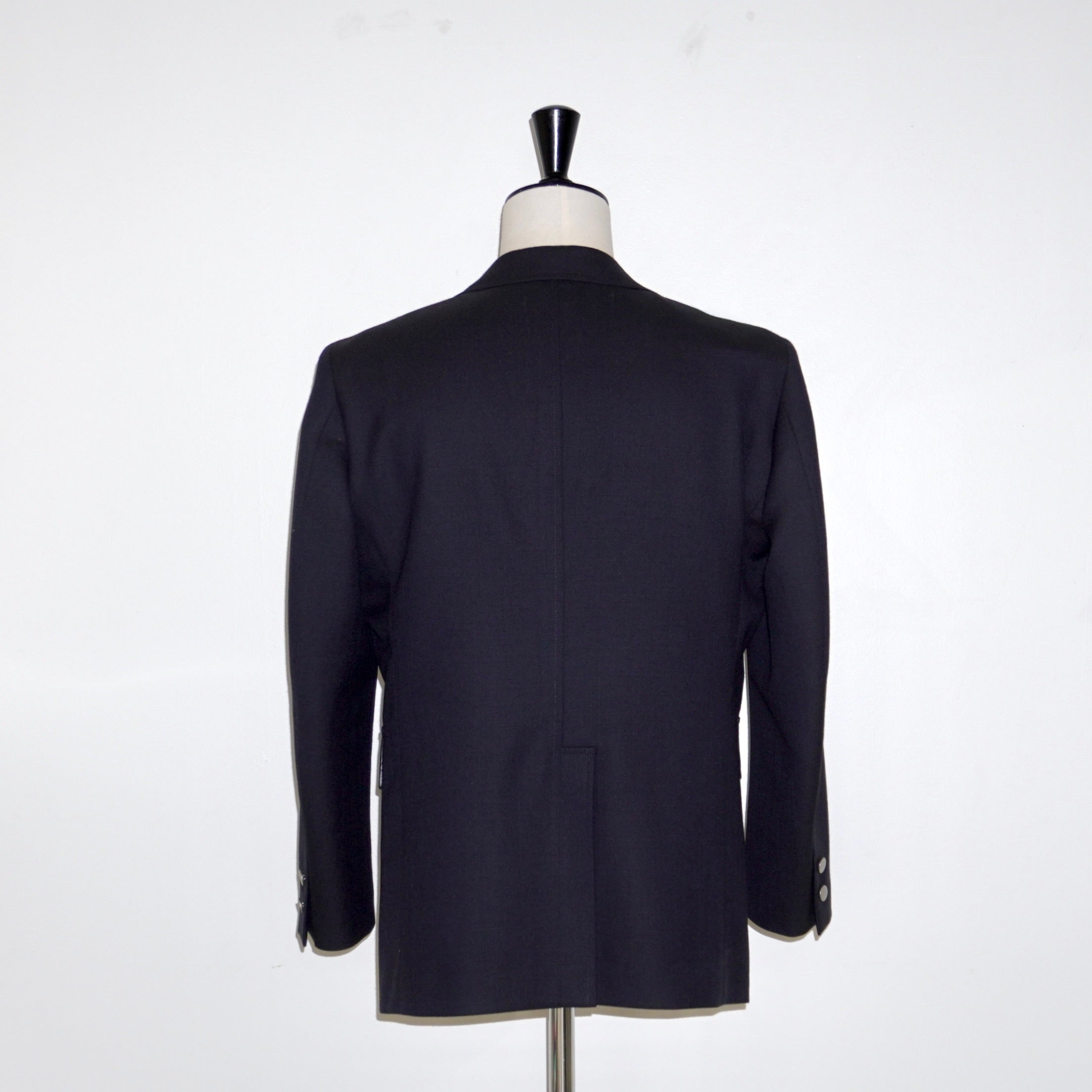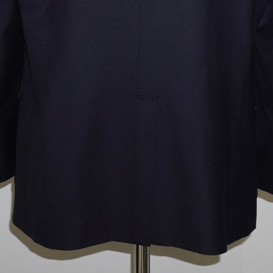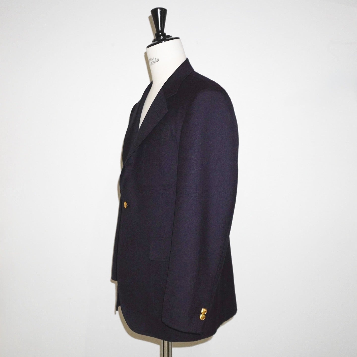 シルバーメタルボタンが、ネイビーやグレーの生地にシャープなアクセントを加える。