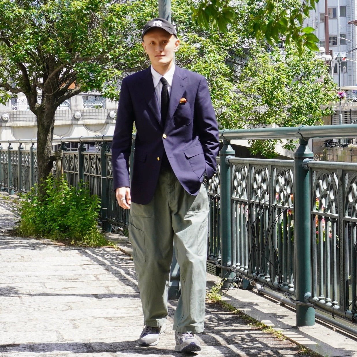 ジャケットとトラウザーズでつくる、都会的なジャケパンスタイル。
