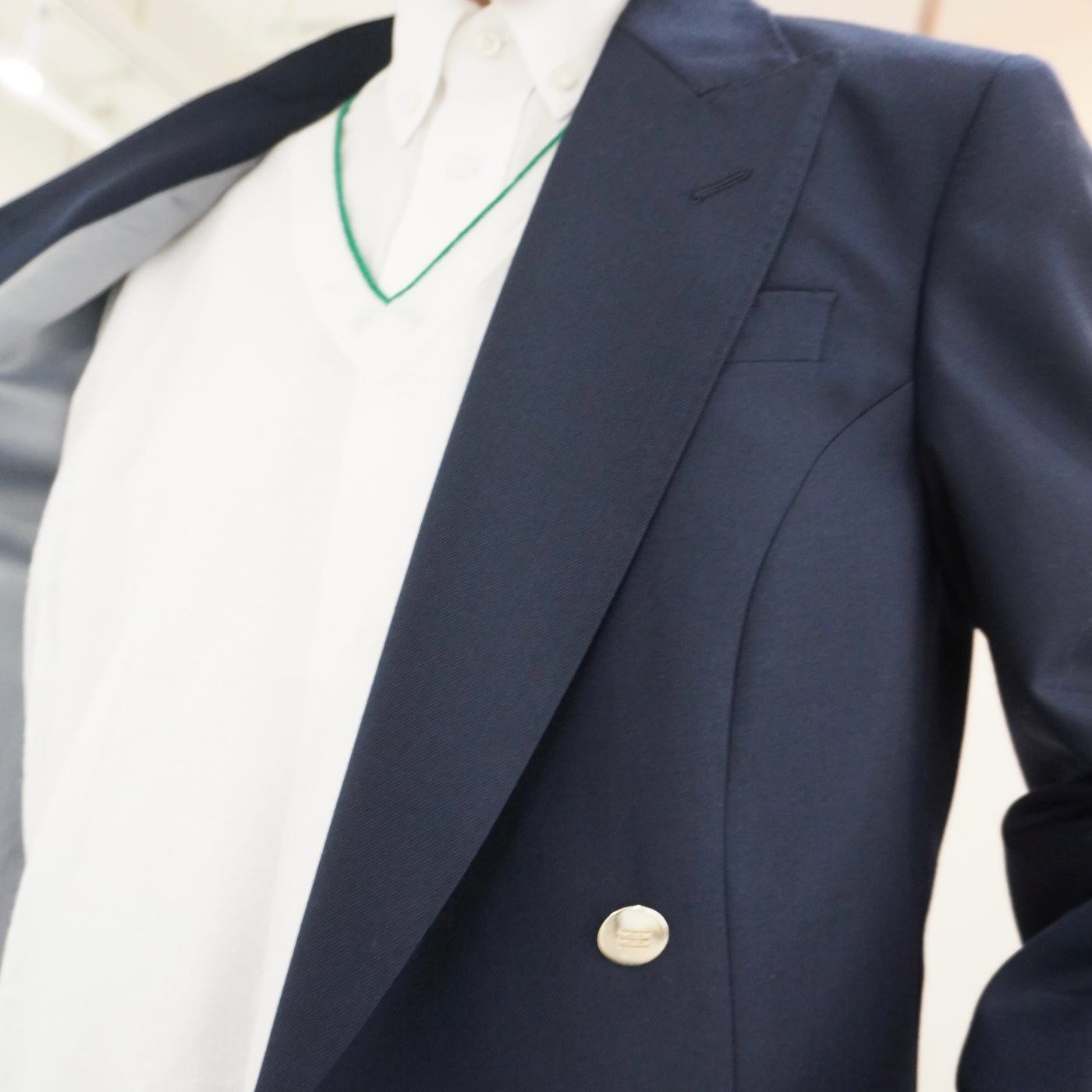 段返り三つボタンがつくる安定したVゾーン。