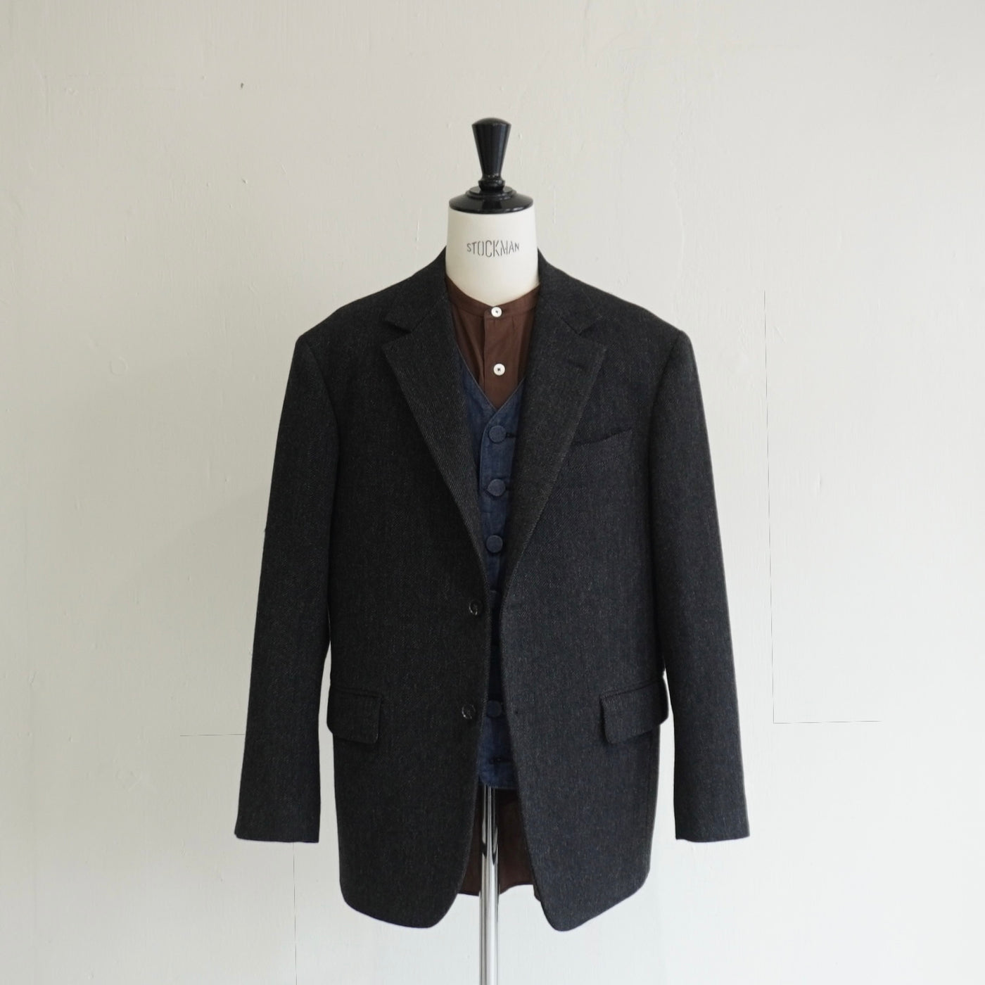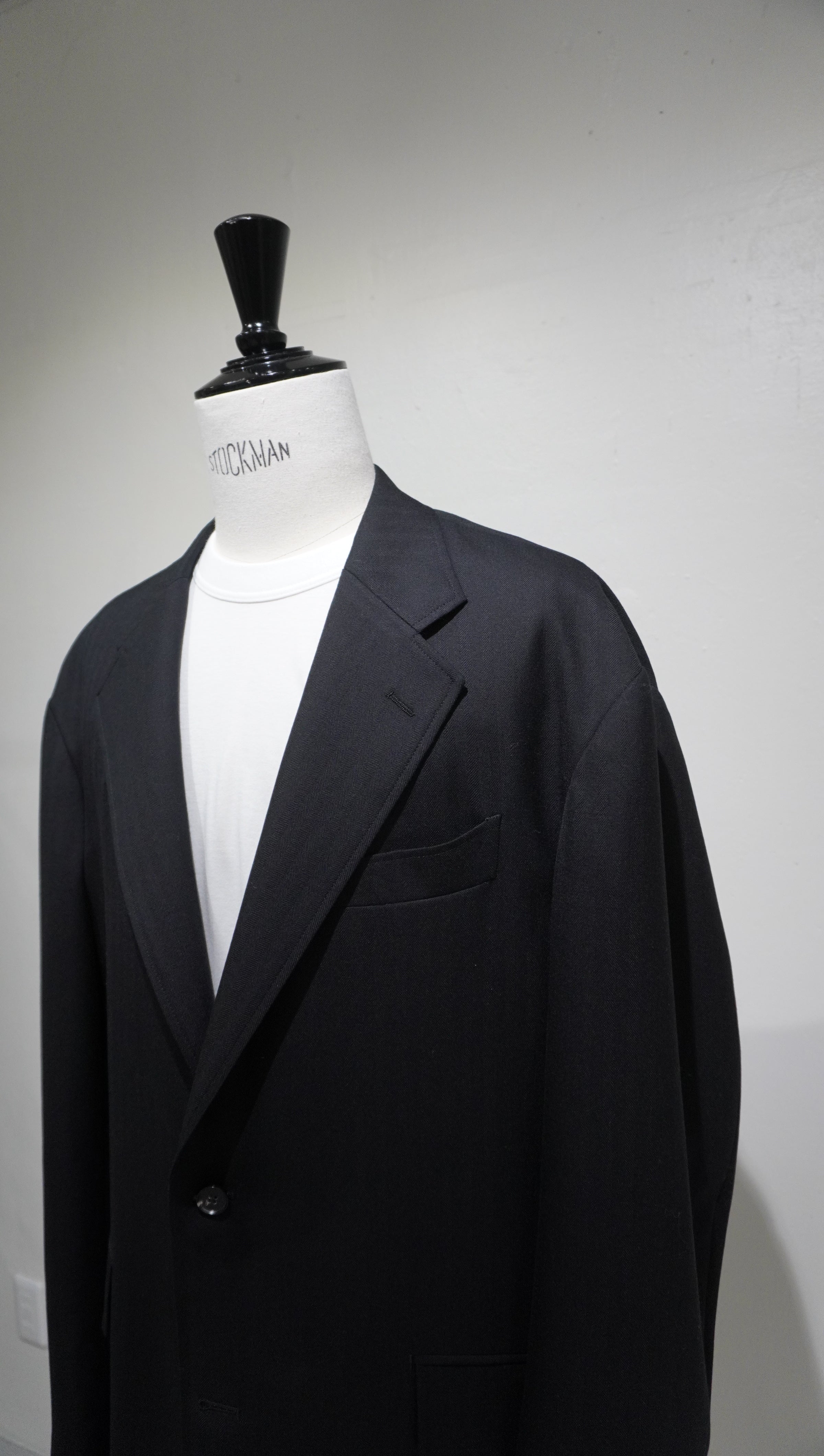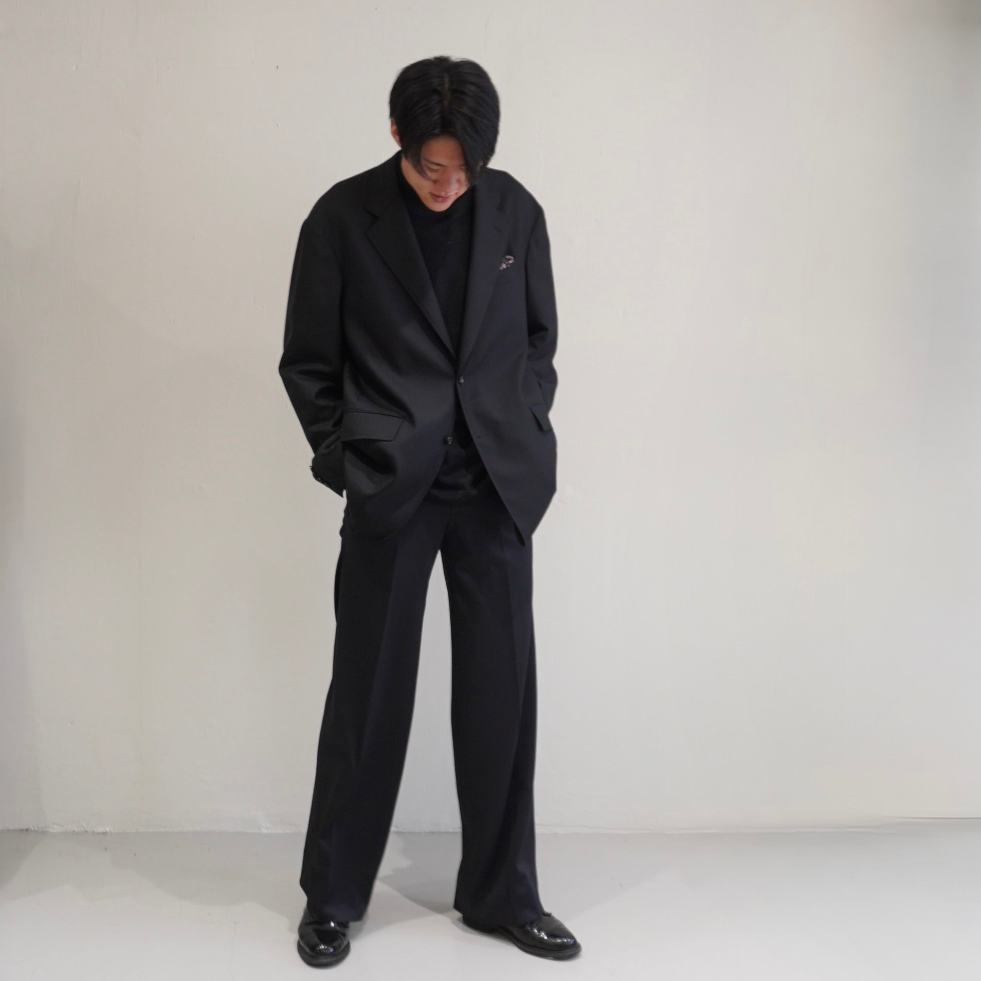 ドロップショルダーが生む抜け感と、英国生地のハリがつくる構築。