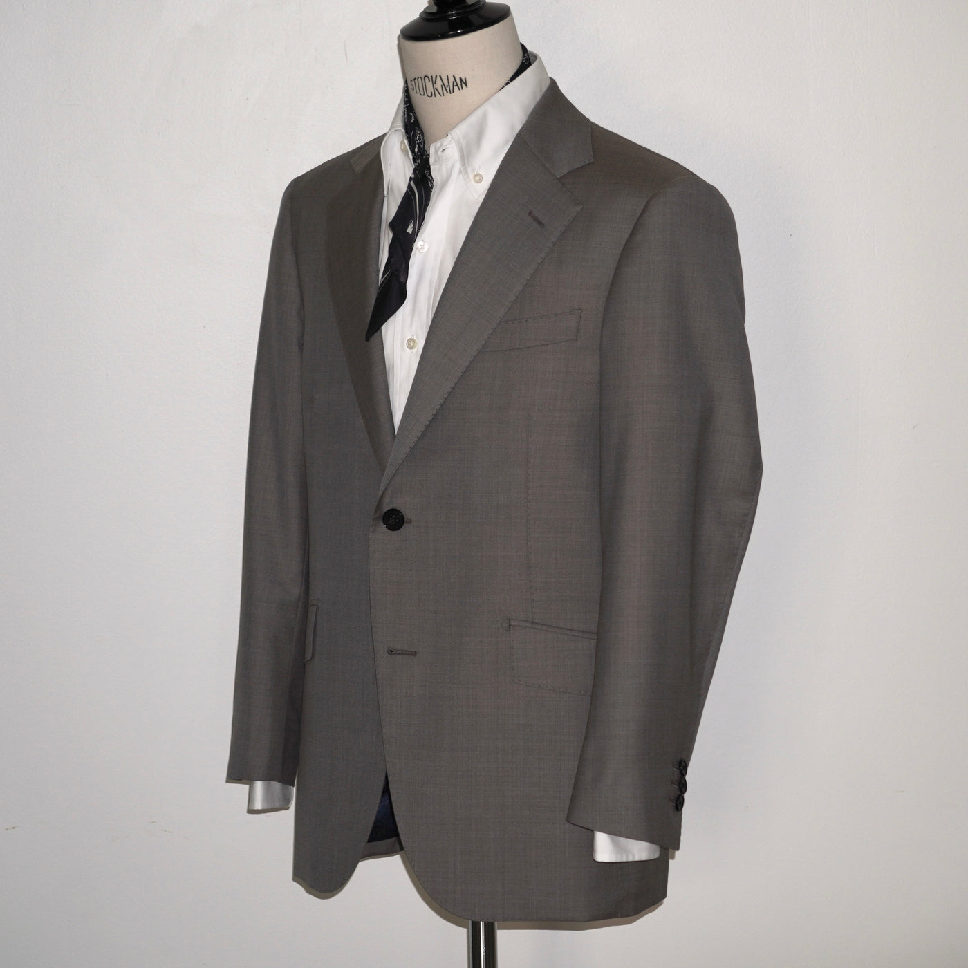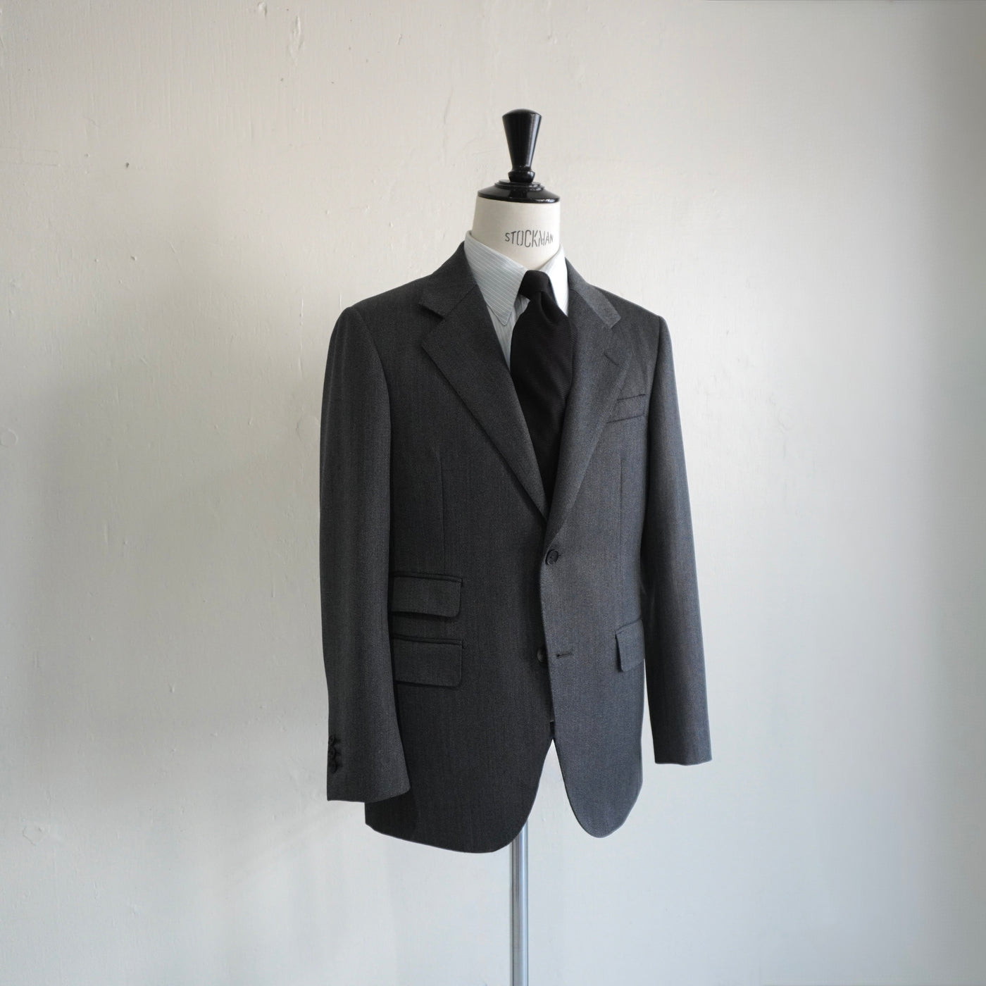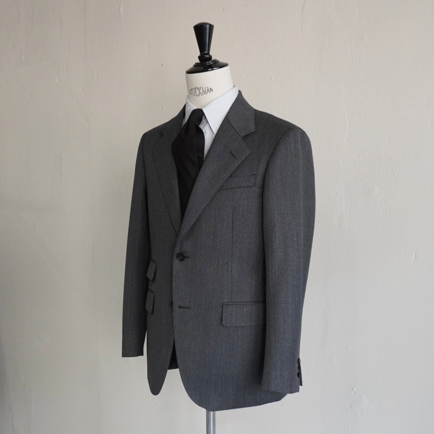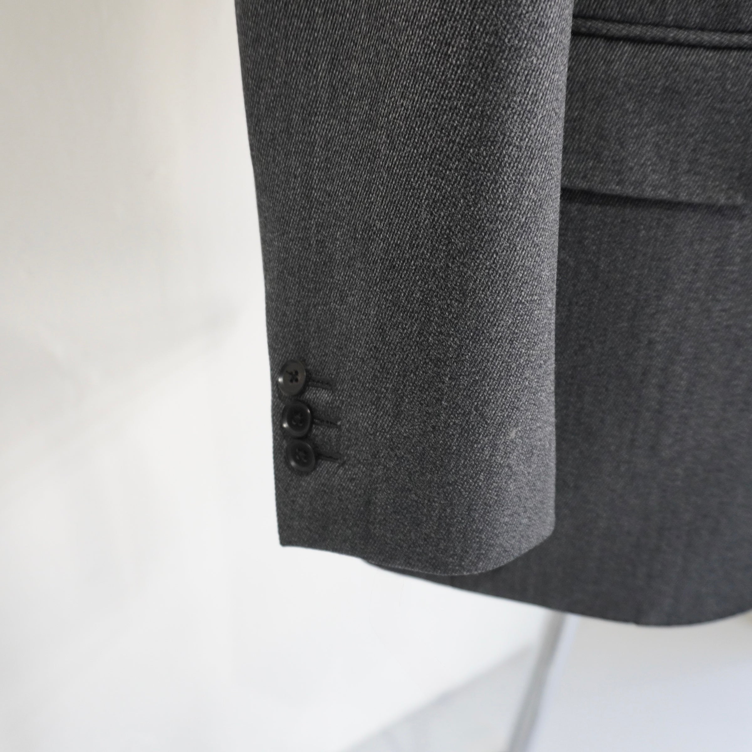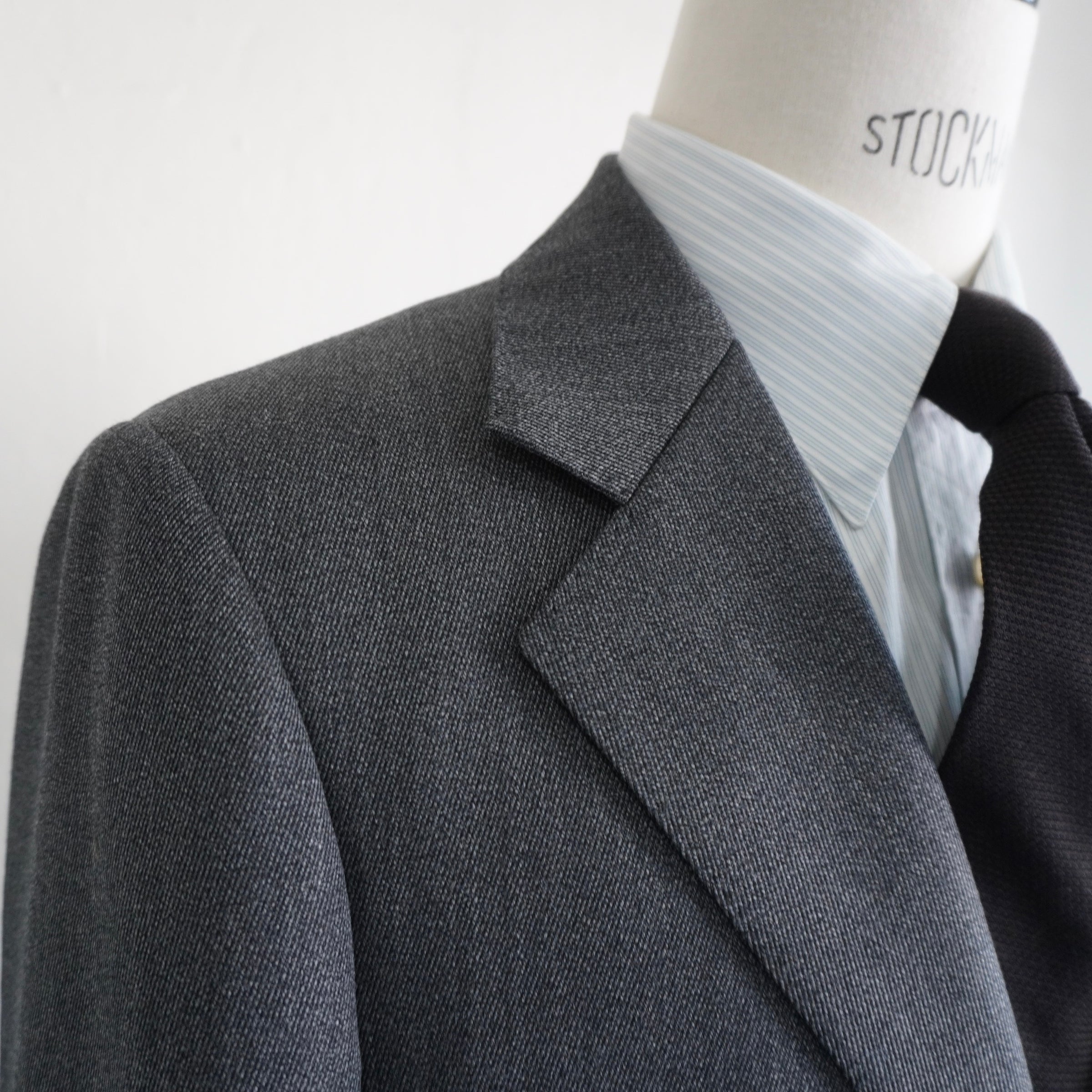 シャークスキン特有の繊細な光沢が、グレーに奥行きを与える。