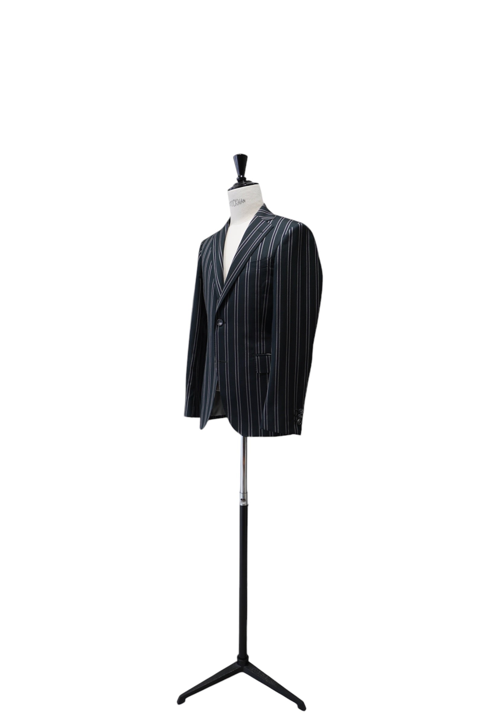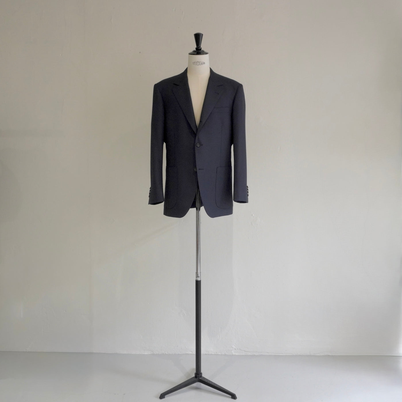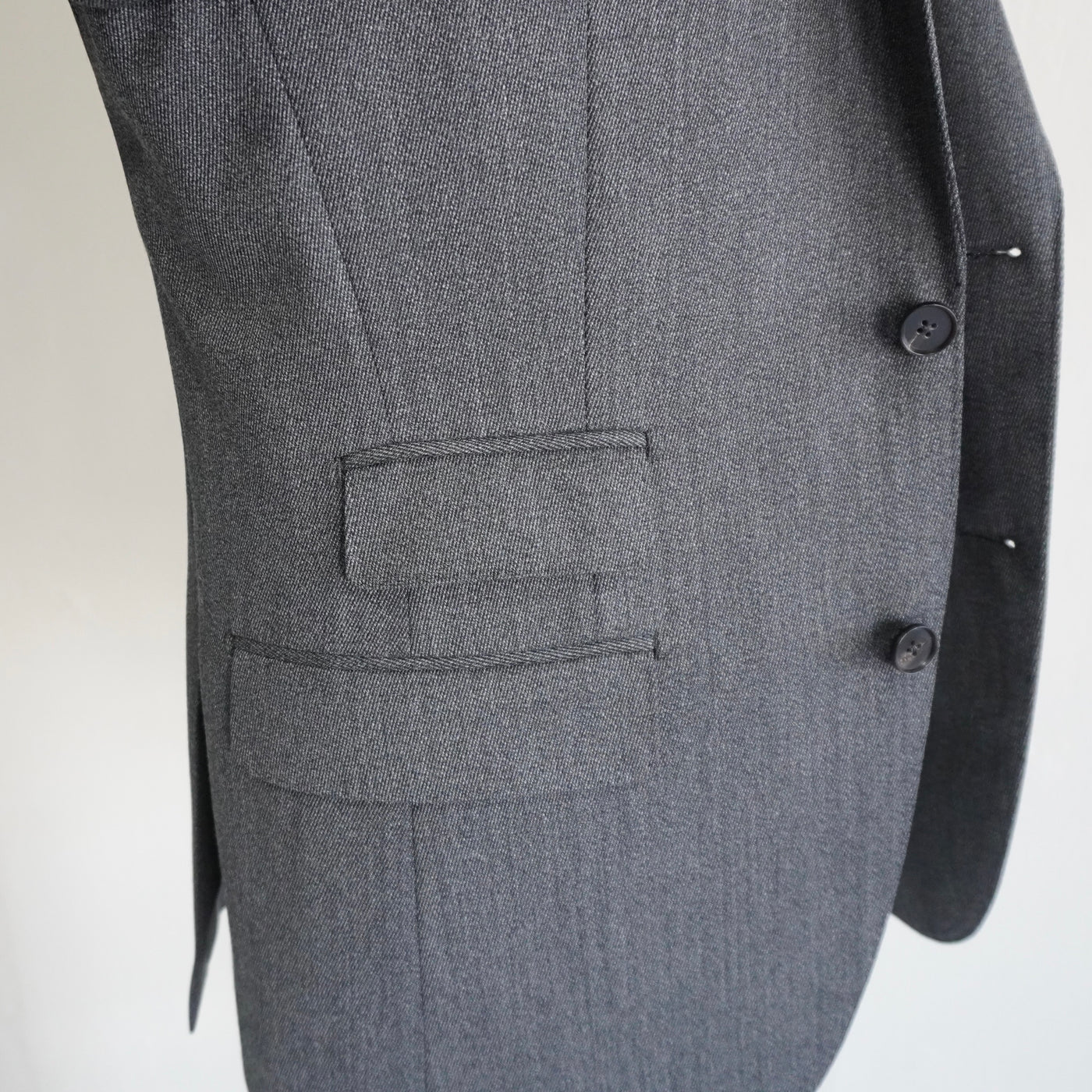 段返り三つボタンで重心を落ち着かせ、