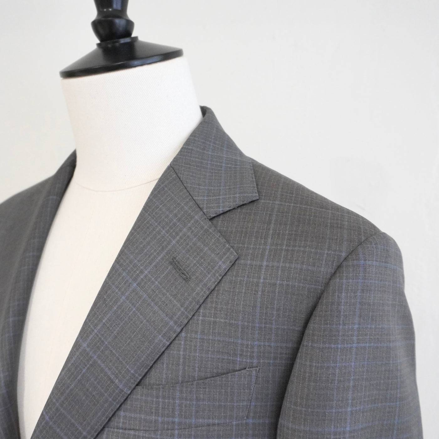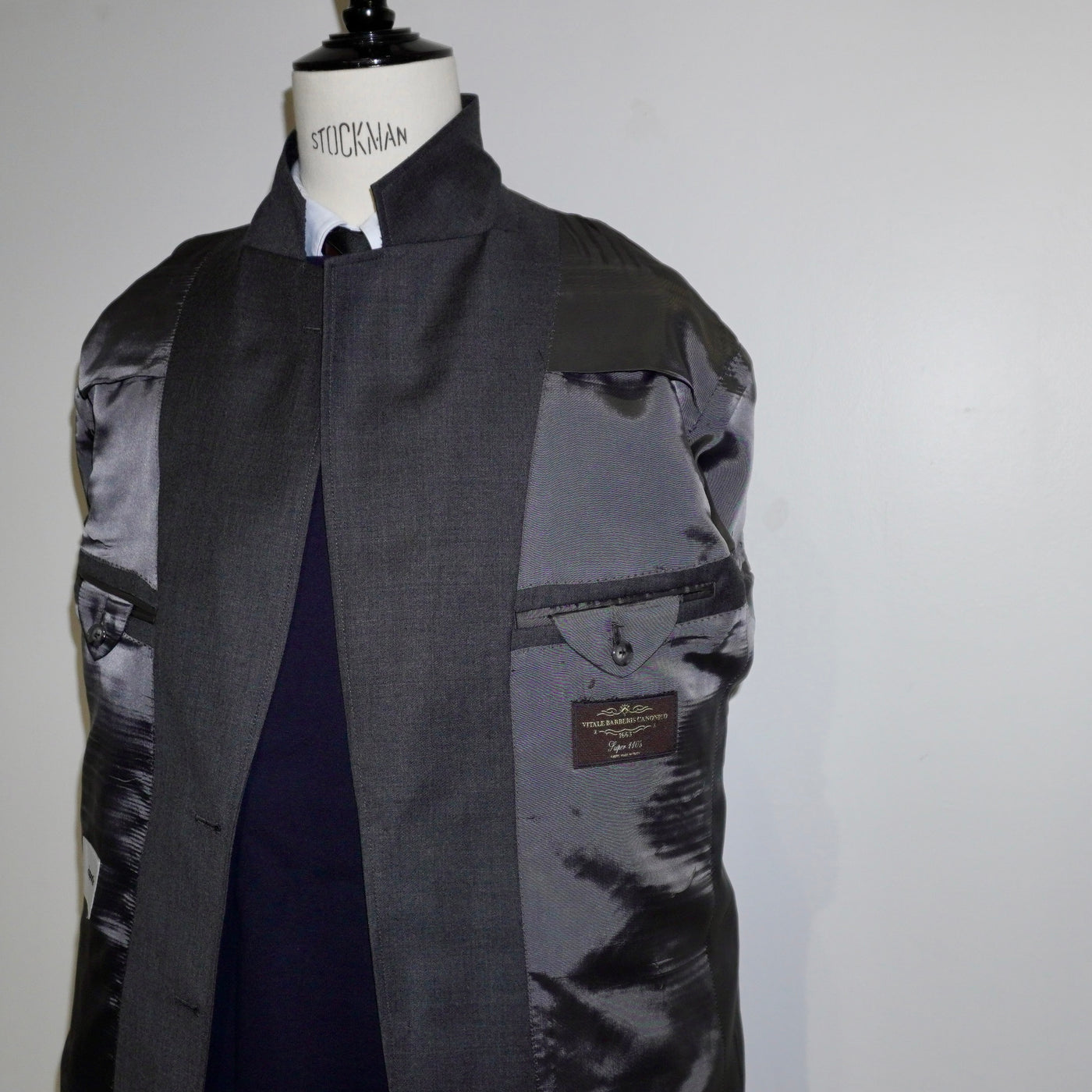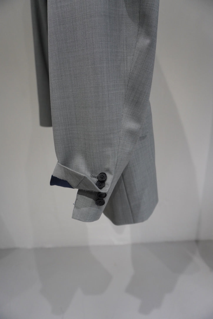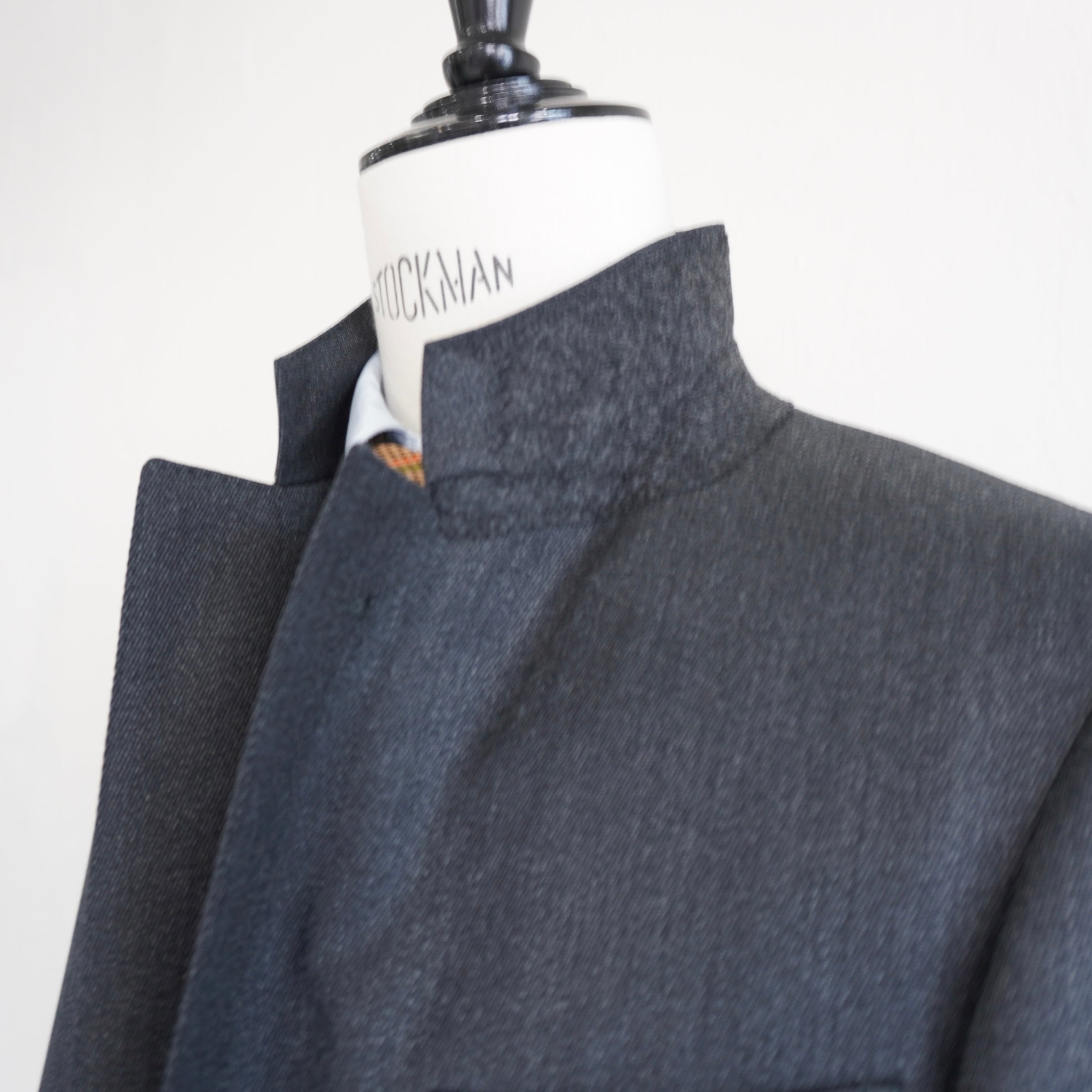その構築的な生地に合わせたのは、やや角度を持たせたセミノッチラペル。