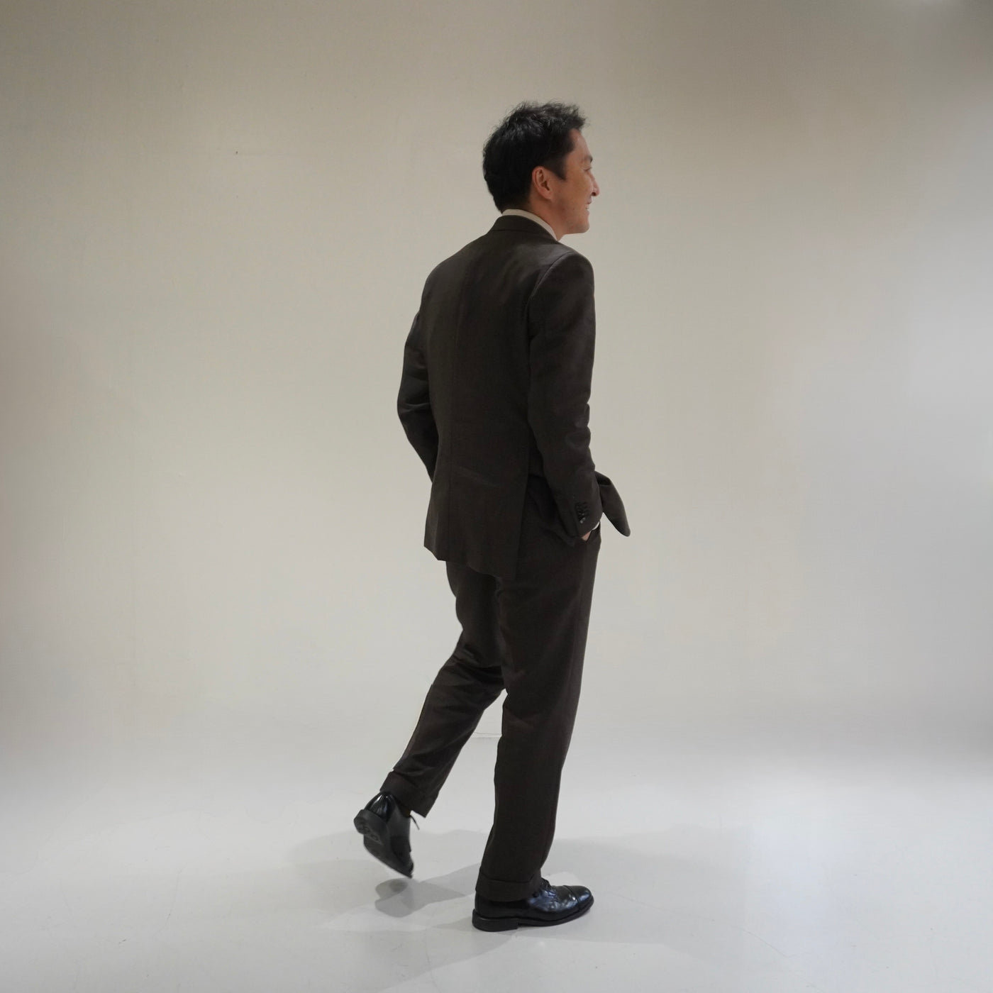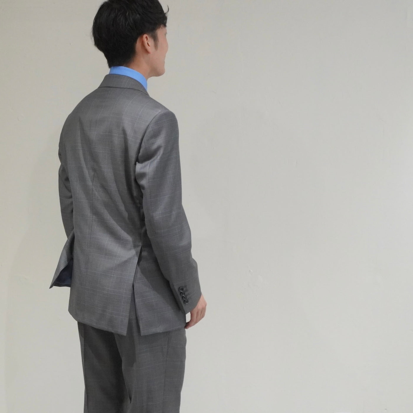 サイドベンツが後ろ姿に軽快さを与え、重厚な生地でも動きを美しく保ちます。